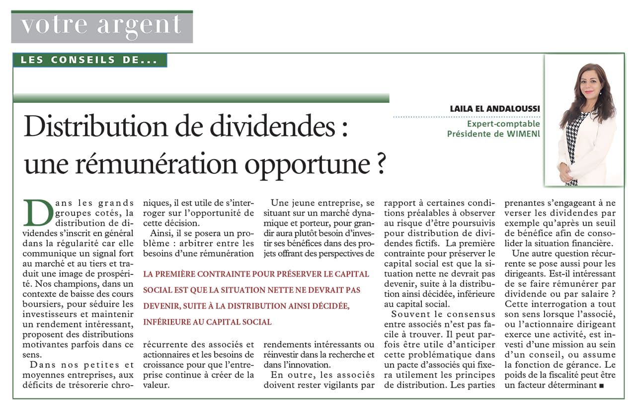 Distribution de dividendes : une rémunération opportune ? Déc 19, 2019 | Chroniques dans la presse économique | 0 commentaires Dans les grands groupes cotés, la distribution de dividendes s’inscrit en général dans la régularité car elle communique unsignal fort au marché et au tiers et traduit une image de prospérité … LAILA EL ANDALOUSSI LA VIE ECO